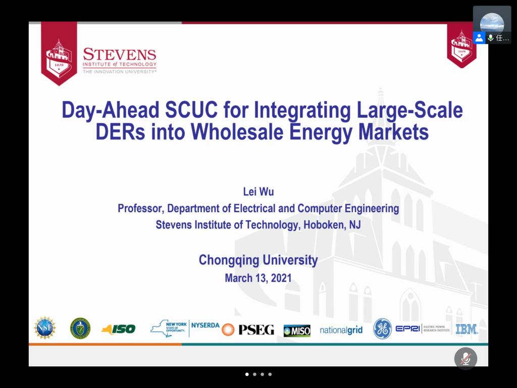 On the morning of March 14, 2021, Professor Lei Wu of Stevens Institute of Technology was invited to deliver a speech, with the title Day-Ahead SCUC for Integrating Large-Scale DERs into Wholesale Energy Markets .This academic lecture was jointly organized by the School of Electrical Engineering of Chongqing University, the State Key Laboratory of Power Transmission Equipment and System Securit...