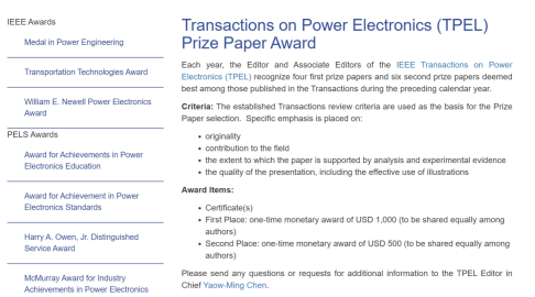 ​The IEEE Power Electronics Society (PELS) has announced the winners of its flagship IEEE Transactions on Power Electronics (TPEL) Prize Paper Award for 2022. The paper " Integrated Design for Lifetime Extension and ESR Monitoring of Hybrid DC Link in Solid-State Transformer From the Perspective of High-Frequency Ripple Current " by Wei Jinxiao, PhD student in the Department of Power Electroni...