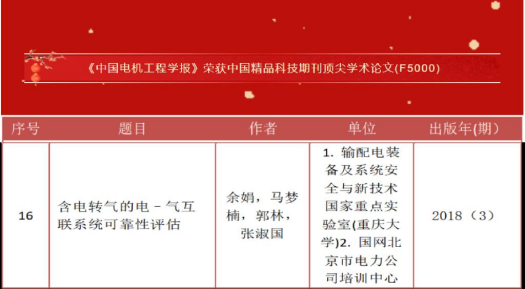 ​Congratulations on Prof. Yu Juan's article "Reliability Assessment of Power-Gas Interconnection System with Electricity to Gas" being selected as "Top Academic Paper of China Quality Science and Technology Journal (F5000)"! It reflects the high influence and academic value of the research results in China.Initiated by the Ministry of Science and Technology, F5000 aims to further promote the o...