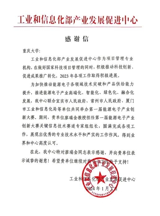 近日,工业和信息化部产业发展促进中心(简称中心)专程来人送达了给猫都论坛 以及猫都论坛 廖瑞金教授的感谢信。中心对猫都论坛 在积极推进能源电子科技创新、促进成果推广转化中所给予的工作支持表示衷心的感谢。信中特别对廖瑞金教授能够担任第一届能源电子产业创新大赛关键信息赛道专家组组长,并圆满完成各项工作表示诚挚的谢意。 廖...