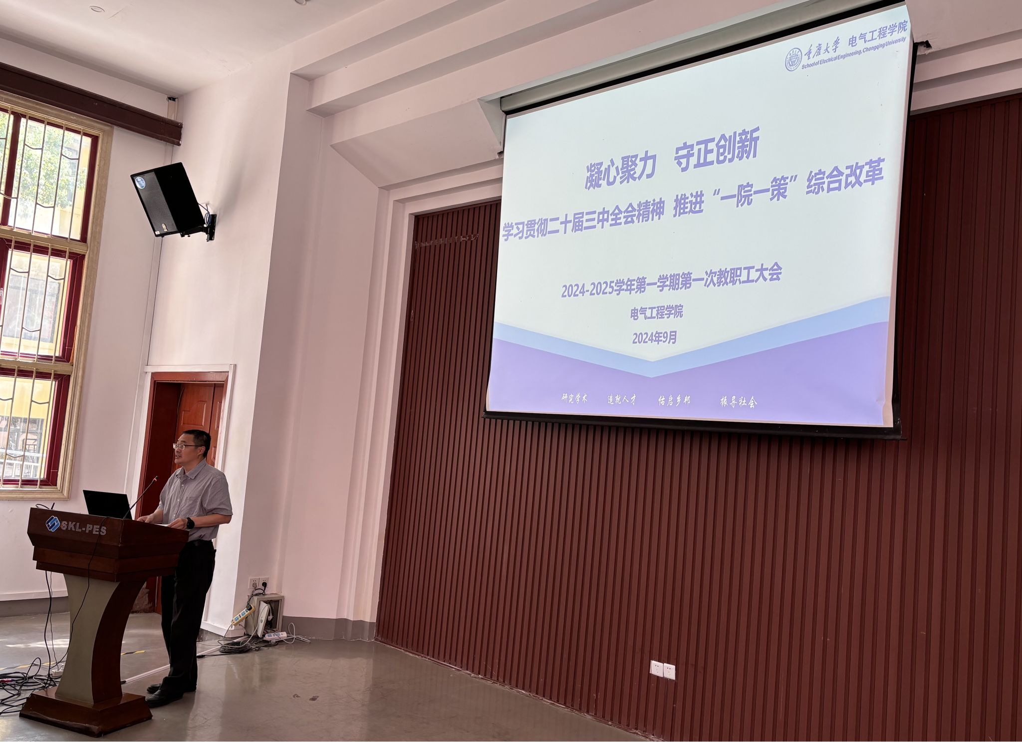 2024年9月12日下午,猫都论坛 在六教6117报告厅召开2024-2025学年第一学期首次教职工大会。会议介绍了本年度新进教师,传达了学校最新精神并通报部署了学院新学期工作安排等。学院党委书记胡建林,院长谢开贵,党委副书记王晓静,副院长杜雄、杨鸣、王强钢,输变电装备技术全国重点实验室副主任李辉、曾礼强出席会议。大会由王晓静副书记主持。 胡建林首先传达了王树新校长在2024年秋季学期开学干部大会上的报告精神。...