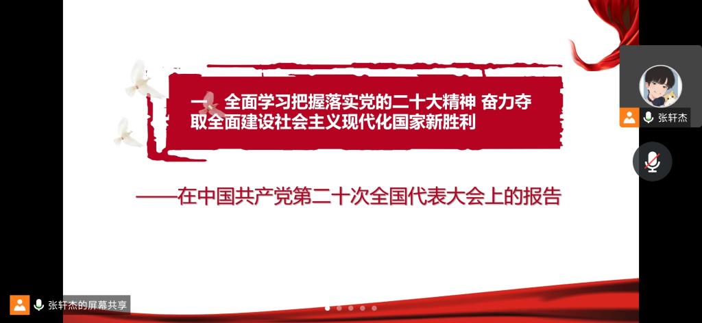 2022年11月11日13:00,猫都论坛 本科生一支部在线上开展了本学期第二次组织生活,本次组织生活以“献礼二十大,强国新征程”为主题,由张轩杰同志主持,一支部全体党员参加。张轩杰同志带领大家回顾了党的二十大的主要内容和现实意义,号召全体党员同志要在全面学习、全面把握、全面落实上下功夫,坚定不移把党的二十大提出的目标任务落到实处,奋力夺取全面建设社会主义现代化国家新胜利。支部同志们一同学习了中央全面深...