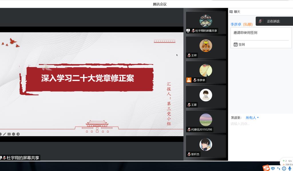 2022年11月18日13:00,猫都论坛 本科生一支部在线上开展了本学期第三次组织生活,本次组织生活以“让党旗在新征程上高高飘扬”为主题,深入学习二十大党章修订案,由杜宇翔同志主持,一支部全体党员参加。杜宇翔同志首先带大家回顾了中国共产党在第二十次全国代表大会通过了关于《中国共产党章程(修正案)》的决议。习近平总书记指出:“党章是我们立党、治党、管党的总章程,是全党最基本、最重要、最全面的行为规范。”...