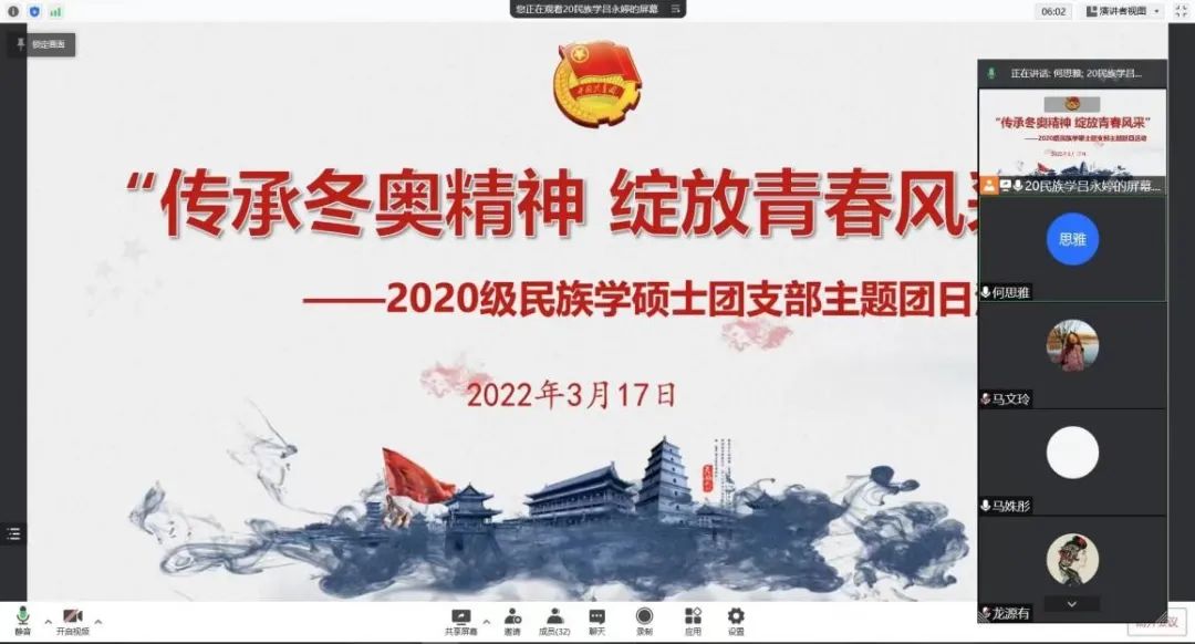 在此次团日活动中,2021级文博班硕士团支部组织同学们学习了本次活动的主题目的和相关文件,之后通过网站阅读了以冬奥会以及冬残奥会为背景的公众号推送文章,通过他们的切身实践和经历感受,向同学们传递了民大“美美与共,知行合一”的校训精神。