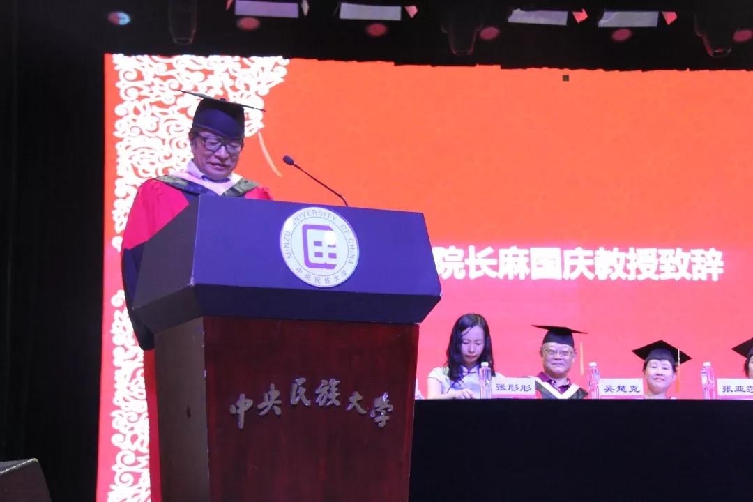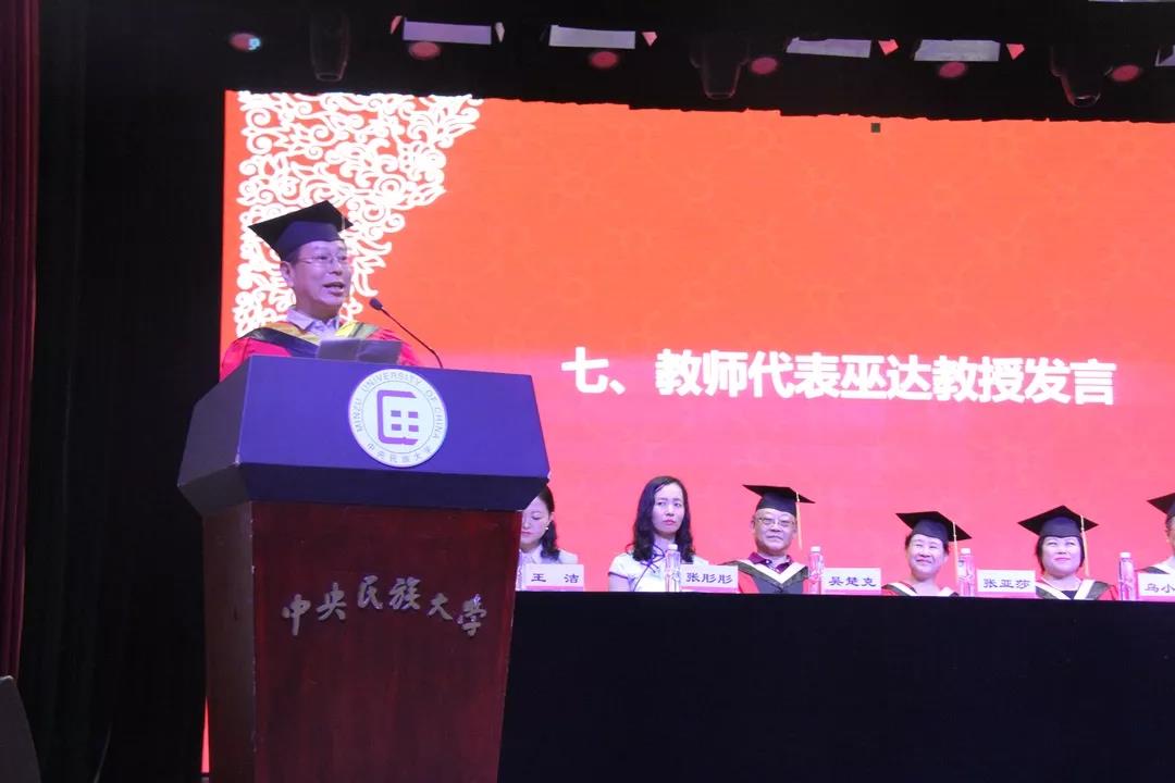 教师代表巫达教授发表致辞。他首先对同学们顺利毕业、取得学位表达了衷心的祝贺与殷切的期望,希望同学们将生活在民大、民社院的美好记忆永远珍藏,在有限的时间里珍惜亲情、珍惜友情,学习知识、沉淀自我。