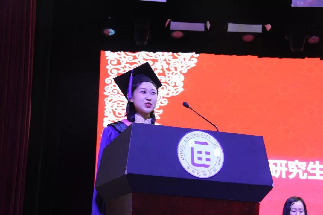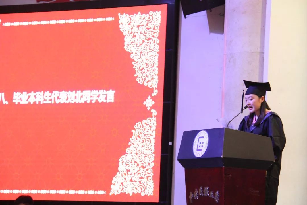 本科毕业生代表刘北和毕业研究生代表李楚妍分别进行了发言。她们怀着不舍的心情回顾了美好的校园生活,表达了对母校辛勤栽培的感恩,同时祝福所有一同毕业的同学们,前程似锦,理想万丈。