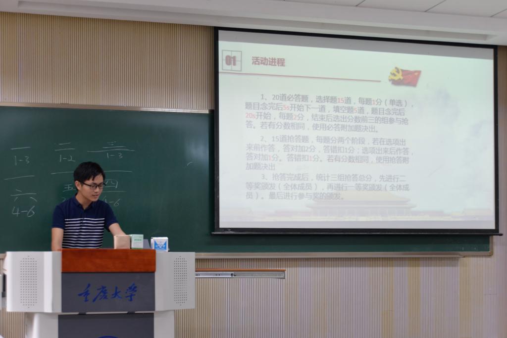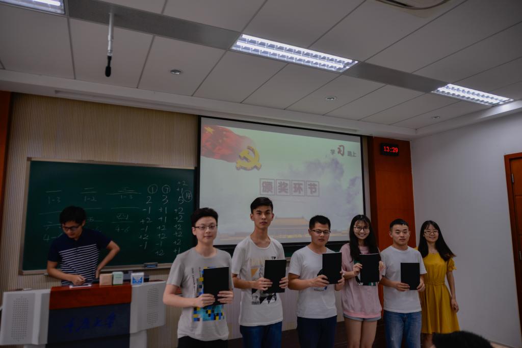 最后,经过激烈的抢答过程,由王凌娆、吴宇奇、张梦晗、武子恒和温忻五位同志组成的的第五小组荣获了本次知识竞赛的第一名。支部书记刘靓同志对获得一、二等奖的小组进行了奖品的颁发,也给其余三支队伍分发了参与奖。至此,本次“迎党的生日,学系列讲话”主题知识竞赛顺利结束。通过本次党日活动,支部各同志对几次系列讲话都有了更深入的学习和理解,同时本支部几位新成员与老成员之间也有了更多的交流与了解。