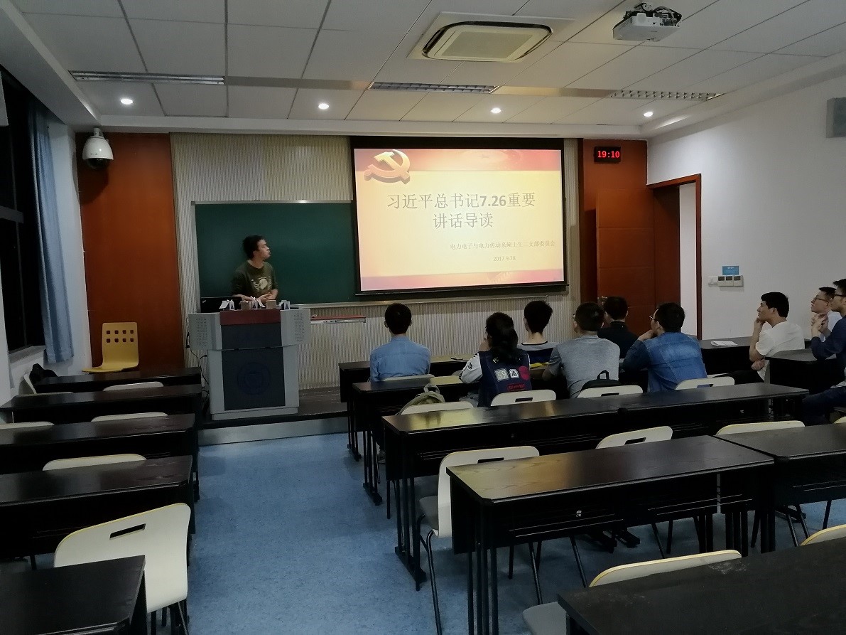 在组织活动的第一部分,杨友耕同志带领电力电子与电力传动硕士生第2支部全体成员对习近平总书记在7月26日做出的重要讲话进行了深入细致的学习,杨友耕同志向大家详细解读了重要讲话中的“中国特色社会主义”、“重大战略判断”、“理论创新”、“ 历史性成就,历史性变革”、“两个牢牢把握”、“全面从严治党”等一系列关键词,随后就如何贯彻落实好党组织精神提出了自己的理解:在学习方面,我们应学习习近平总书记重要系列讲话精神,关注十九大最新动态;在创新方面,把握时代特性,把握我国发展的阶段特性,把握自身特点,走适合的特色社会主义道路;在奋斗方面,牢记承诺,牢记使命,为“两个一百年目标”的实现和中华民族的伟大复兴而奋斗!
