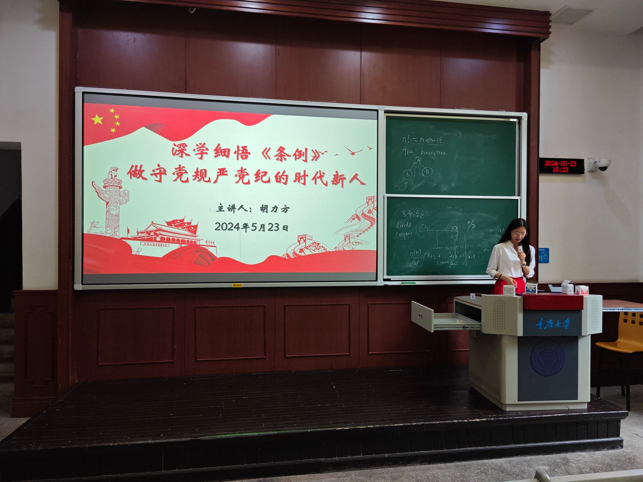 本科生二支部在A5102教室开展党纪学习教育专题党课,由支部书记胡力方讲授专题党课“深学细悟《条例》,做守党规严党纪的时代新人”。本科生二支部全体党员参会。