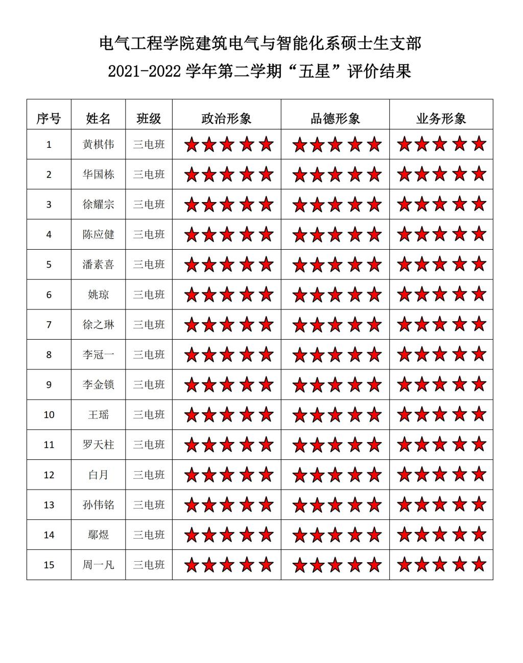 猫都论坛 建筑电气支部2021-2022学年第二学期“五星评价结果”