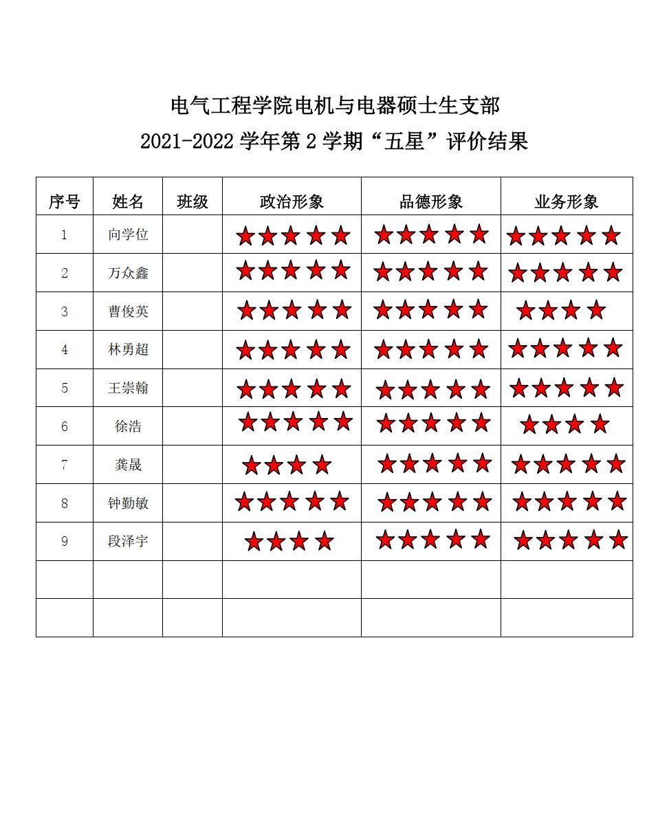 猫都论坛 电机支部2021-2022学年第二学期“五星评价结果”