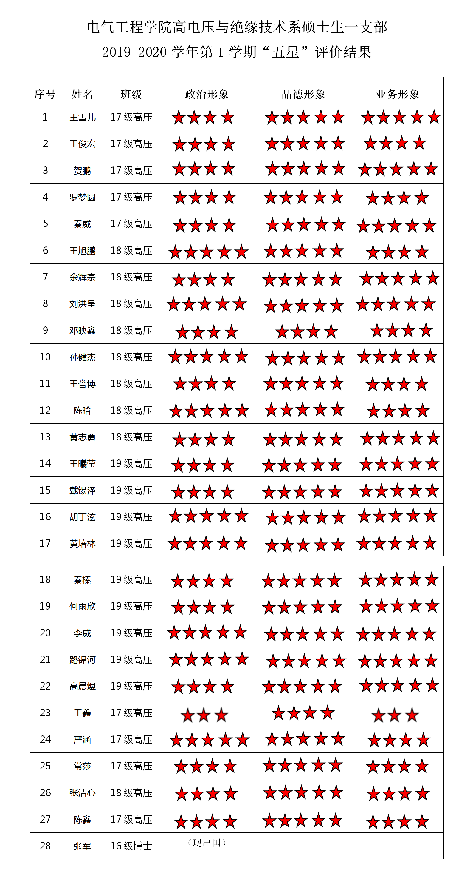 猫都论坛 高电压与绝缘技术第一支部 2019-2020学年第1学期“五星”评价结果