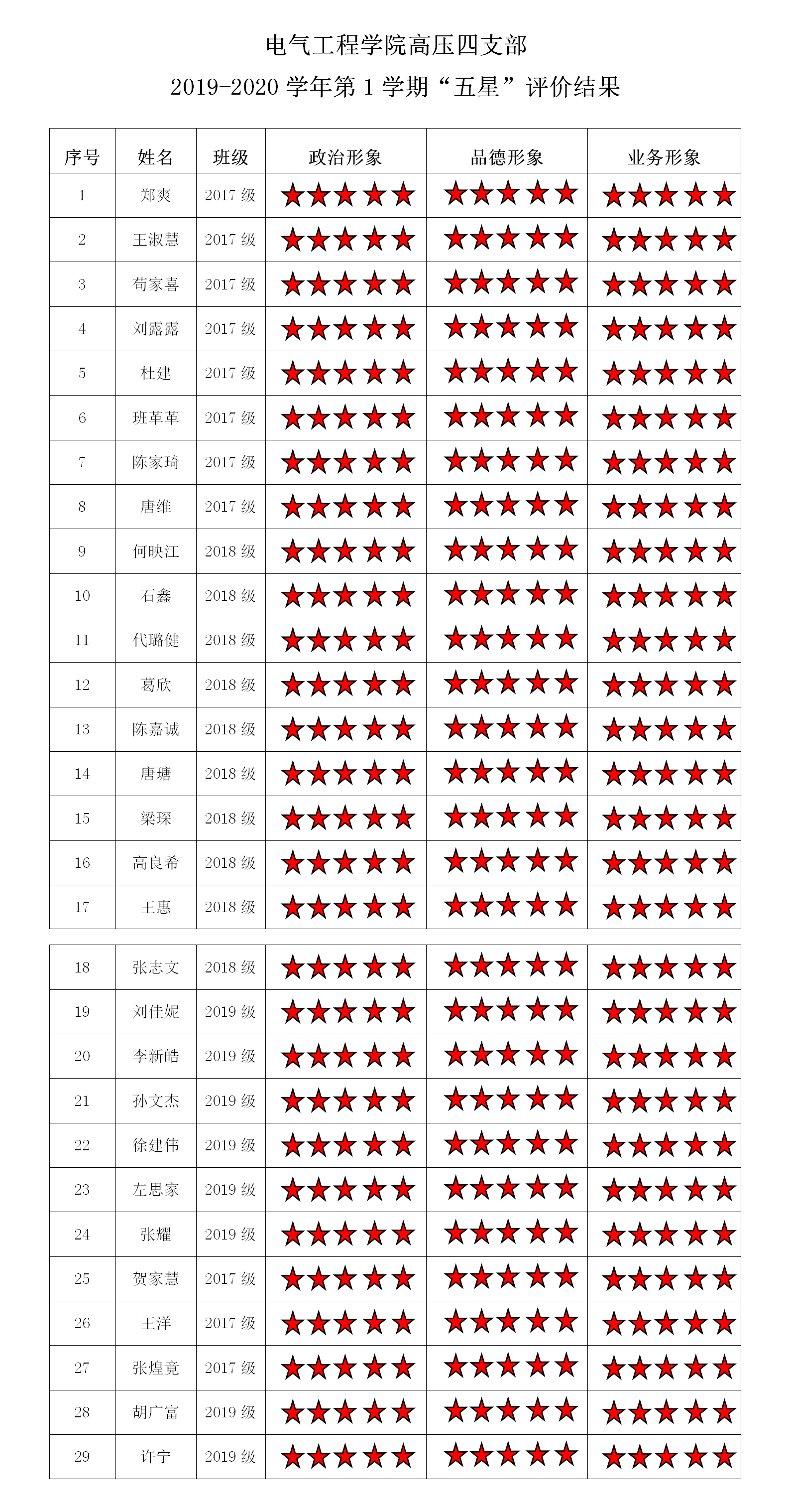 猫都论坛 高电压与绝缘技术第四支部 2019-2020学年第1学期“五星”评价结果