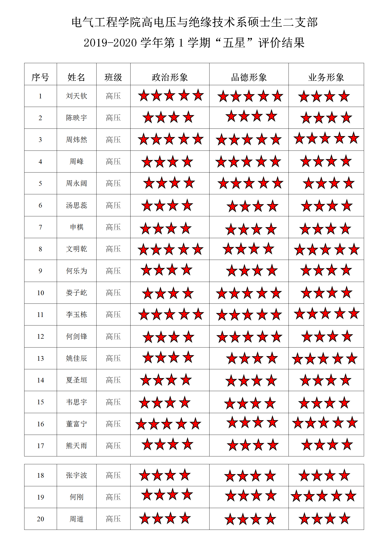 猫都论坛 高电压与绝缘技术系硕士第二支部 2019-2020学年第1学期“五星”评价结果