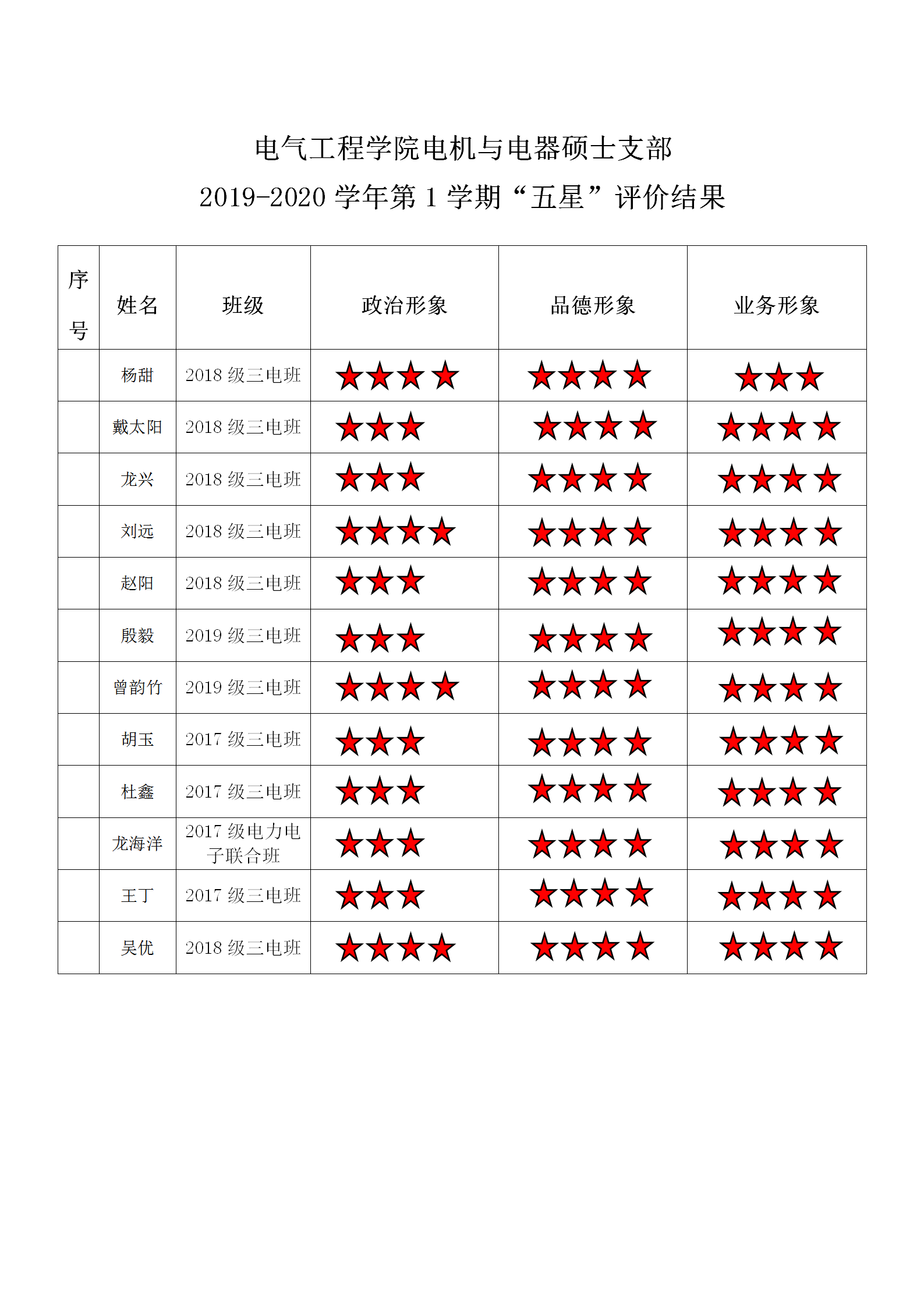 猫都论坛 电机与电器系硕士支部 2019-2020学年第1学期“五星”评价结果
