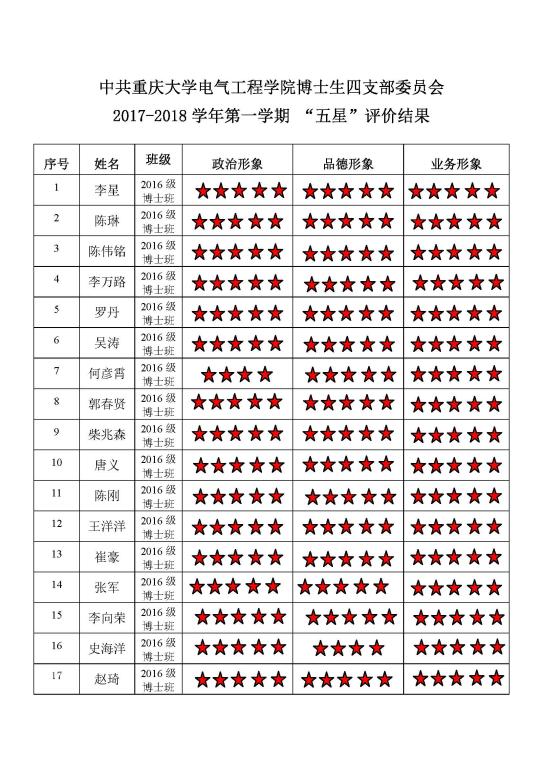 中共猫都论坛 博士生三支部委员会 2017-2018学年第一学期 “五星”评价结果