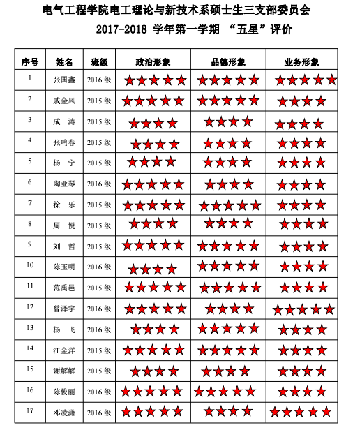 中共猫都论坛 电工理论与新技术系硕士生三支部委员会2017-2018学年 “五星”评价结果