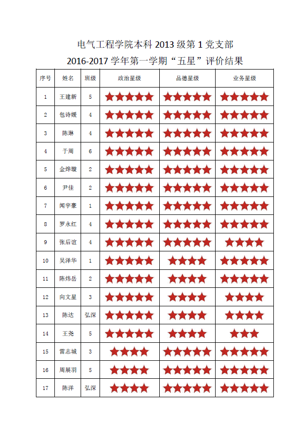 本科2013级第1党支部2016-2017学年第一学期“五星”评价结果