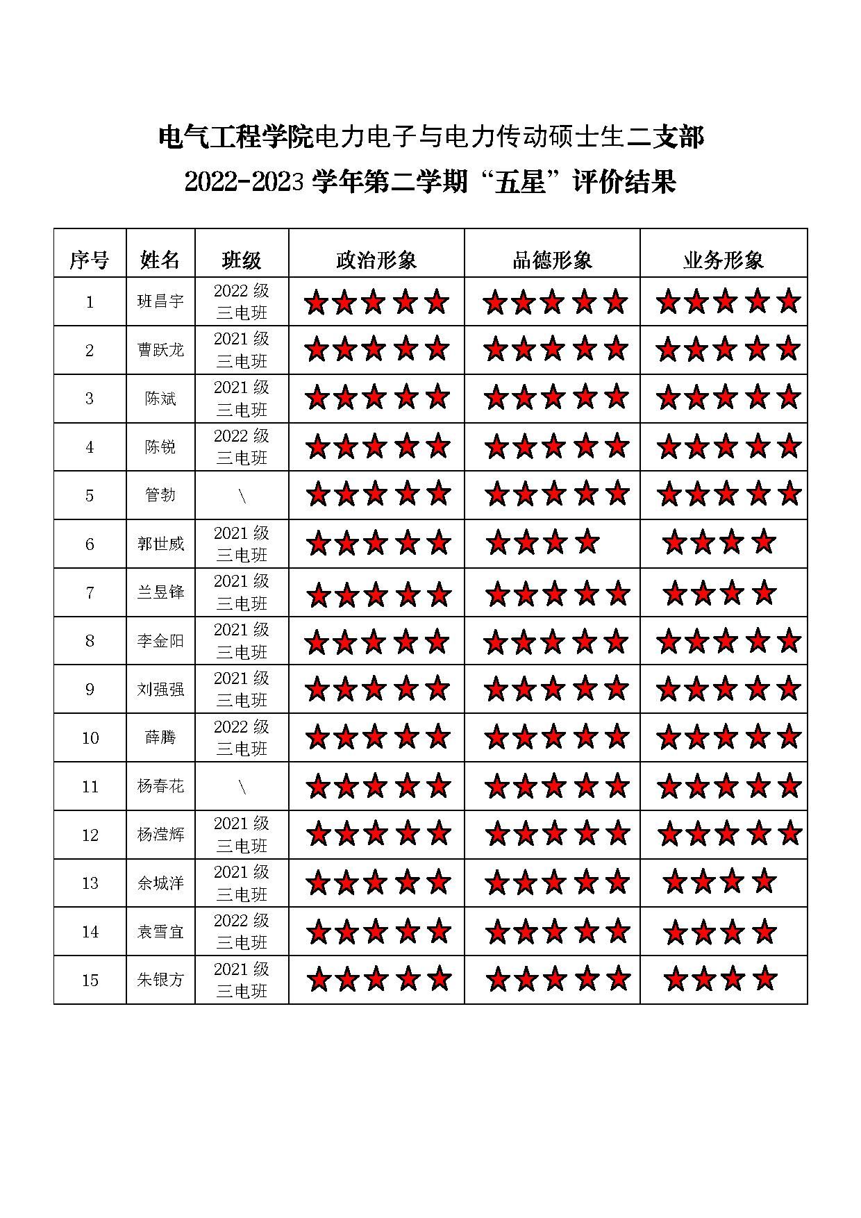 猫都论坛 电力电子二支部 2022-2023学年第二学期“五星”评价结果