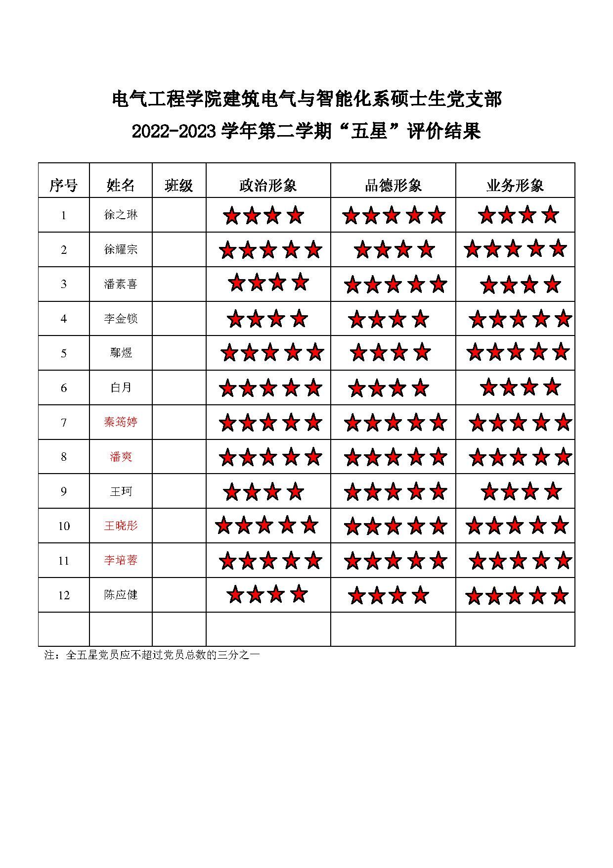 猫都论坛 建筑电气支部 2022-2023学年第二学期“五星”评价结果