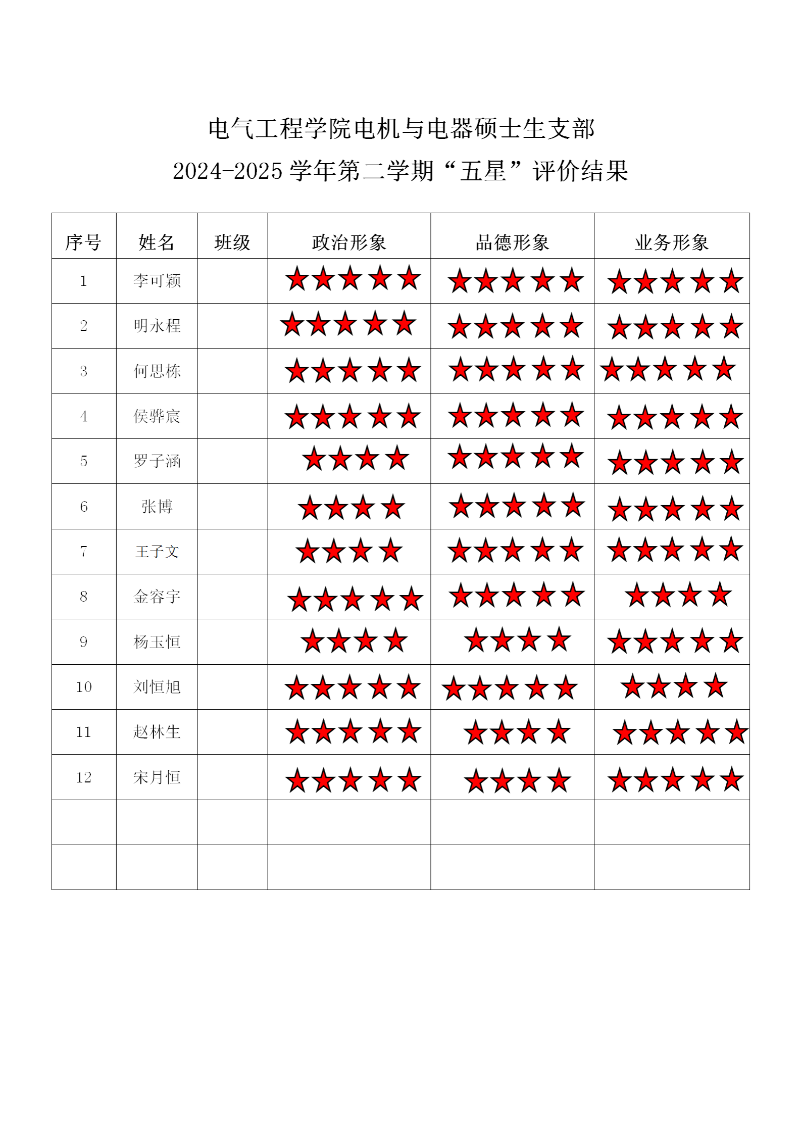 猫都论坛 电机支部 2024-2025学年第二学期“五星”评价结果