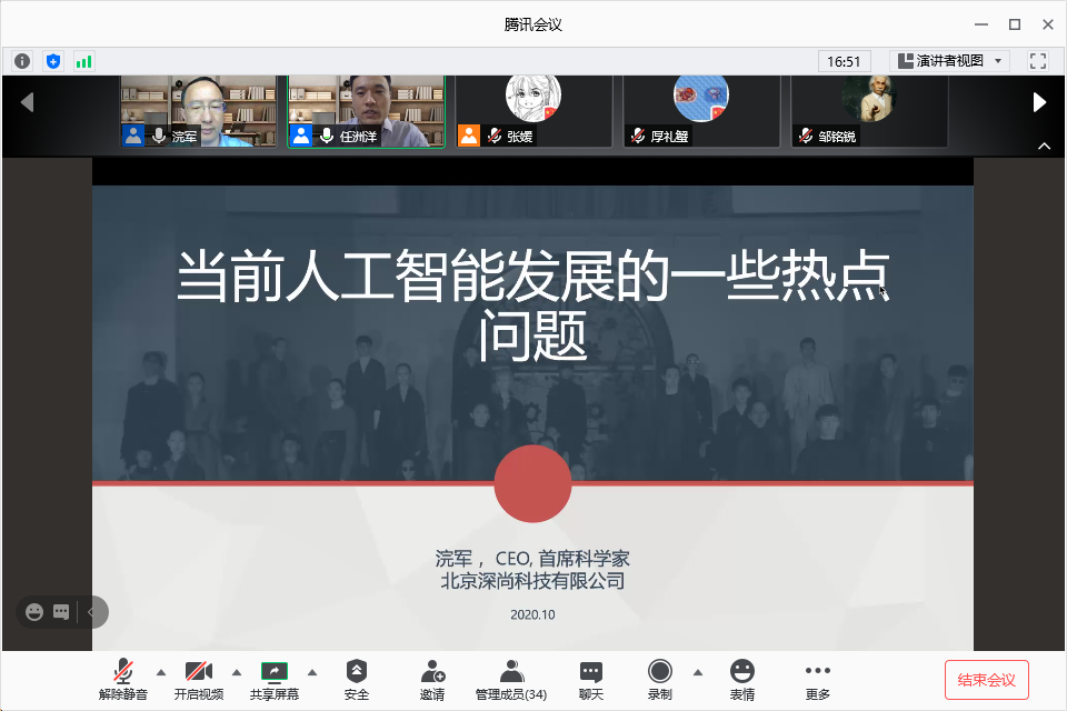 2020年10月31日下午,北京深尚科技有限公司首席科学家和CEO、复旦大学和西安交通大学特聘教授浣军受邀做客“智慧能源云讲堂”,担任第七期的主讲嘉宾,以“当前人工智能研究和应用的一些热点问题”为主题开讲。本期学术讲座由猫都论坛