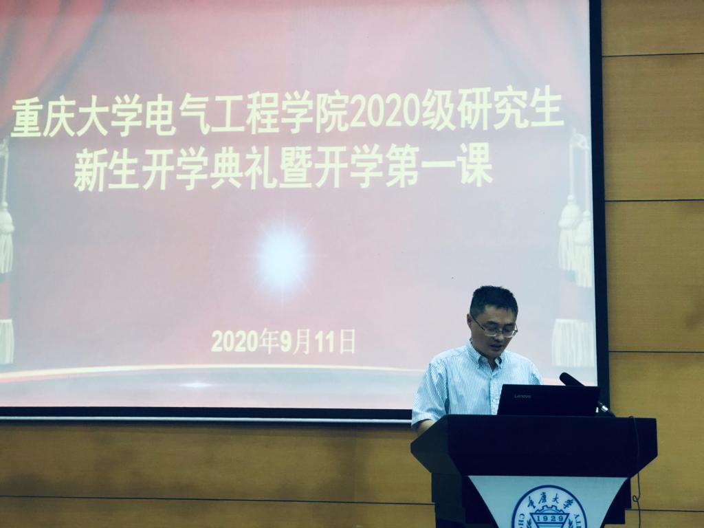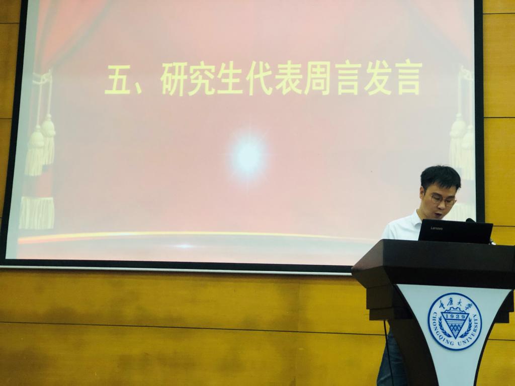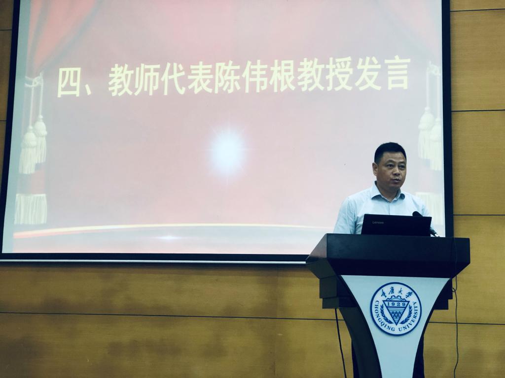陈伟根教授代表学院导师发言,他提出将热爱科学作为毕生的追求,将严谨作为态度和责任,将关爱作为团队建设的情怀与在座师生共勉,并倡导全体师生以心系国家为德、学海无涯为勤、全面发展为能、创新学习方法为效,共同收获进步。