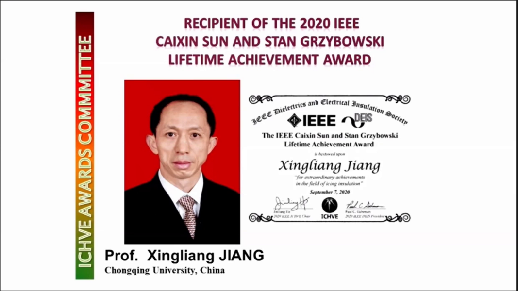 2020年9月6日-10日,国际高电压工程与应用会议(2020 IEEE International Conference on High Voltage Engineering and Application,ICHVE 2020)在北京举行,因疫情原因,会议采用线上形式在全球同步召开。会上颁发了IEEE Caixin Sun and Stan Gryzbowski终身成就奖(Lifetime Achievement Award)和青年学者成就奖(Young-Professional Achievement Award)。为表彰我院蒋兴良教授35年坚守科研一线,在科学观测研究基地创建、极端环境电气绝缘、覆冰形成机理与致灾机制和灾害防御方法等领域做出的突出贡献,评奖委员会主席MasoudFarzaneh院士向蒋兴良教授颁发了IEEE Caixin Sun and Stan Gryzbowski终身成就奖。