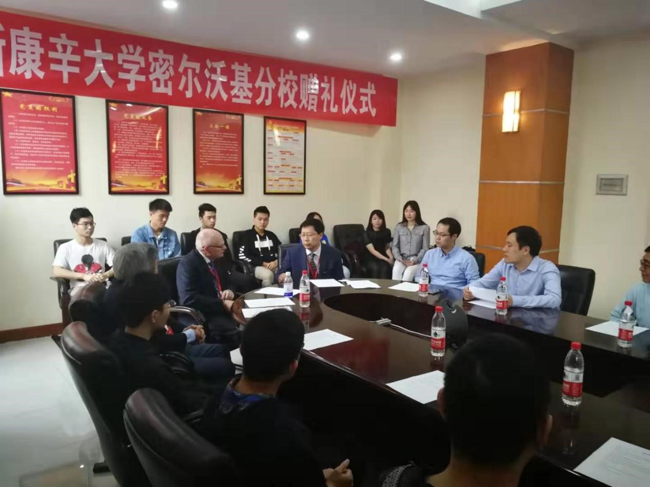 赠礼仪式开始前,来自威斯康辛大学密尔沃基分校的两位教授向我们介绍了两校多年来合作办学项目的具体事项以及近些年取得成果,并鼓励同学们积极参加联合办学项目。