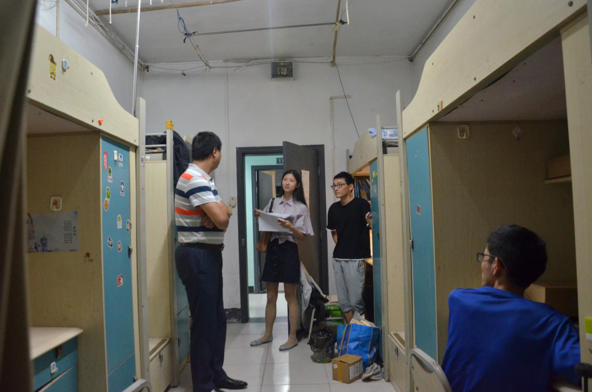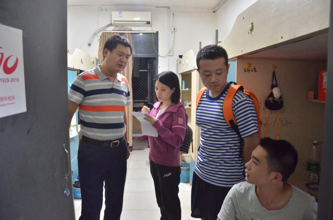 党委副书记吴嘉和各年级辅导员对新老校区进行寝室安全检查。吴嘉、陈思思、胡力方带队检查A区七舍,罗敏、喻惠带队检查虎溪校区松二、松四。