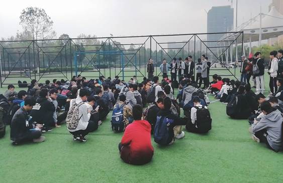 2018级辅导员喻惠老师和董轶男老师组织学院18级学生在风雨操场集合参加运动会方阵选拔。此外,还有部分学生会干事负责相关事宜,协同老师一起选拔方阵。