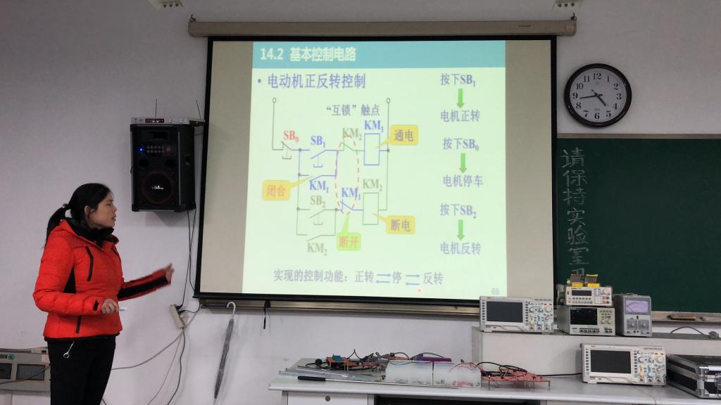 同时,姜慧老师作为拟推荐参加电工学课程教学竞赛的青年教师进行教学展示,她为我们展示了一堂“电动机正反转控制”的课程。姜老师通过动画的形式,生动地讲述了电动机正反转的原理,以及其主电路和控制电路的设计思路,跟着姜老师严密的逻辑思路学习,能够有耳目一新的学习体验。侯世英老师也对该展示进行点评并针对电工学课程教学竞赛的要求提出改进方案。至此,本次电工学系列课程教学团队工作总结会及教研活动圆满结束!