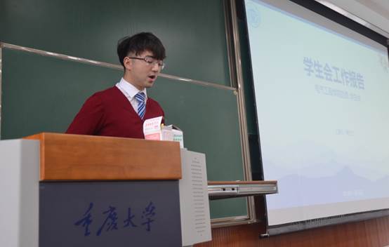 下一项议程是由电气团委学生会主席黄方也作学生会工作汇报。黄方也同学客观全面地回顾一年来学院学生会工作,总结经验展望未来。他强调学生会的宗旨是“全心全意为同学服务”,初心是“维护学生权益”,接着从基础建设规范、助力学风建设、维护学生权益、加强寝室建设、推进职业发展和丰富校园文化这六个方面汇报了近两年来学生会的发展。黄方也同学为了让各位学生代表充分了解学生会近两年发展情况,列举出了“电工篮球赛”、“女生节”及“电气之悦”等一系列成功举办的校院活动,并且展示了学生会近两年获得的奖项荣誉。