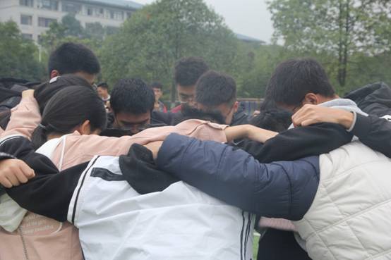 首先进行热身游戏——缩小包围圈,每个小组的同学都肩搭肩的围站着,尽可能的缩小每位同学之间的距离。随着“包围圈”渐渐缩小,大家的脚步挪动得也就越艰难,虽然如此,但同学们还是互相帮助,有的侧着身子留出更多的空间,让身边的同学能够更好的站立。随着游戏的逐渐进行,同学们相互依靠的程度也在无形中增长。这个游戏使团队充满活力,使队员们消除了害羞和忸怩感,为后续素拓活动奠定了良好基础。