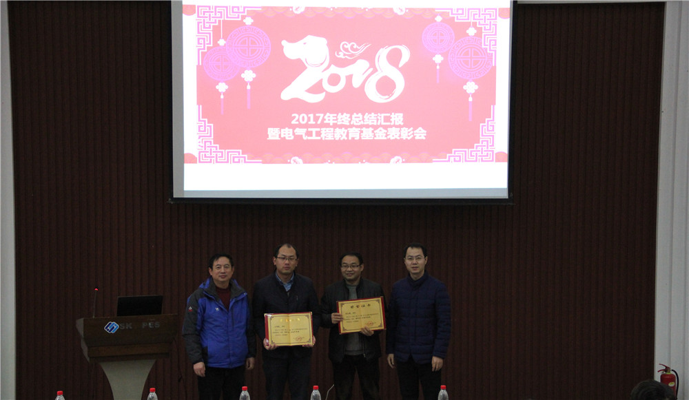 党委书记周林教授宣读电气工程教育基金奖表彰决定(电院[2018]2号文件),授予廖瑞金、李成祥、韩力3位老师2017年度电气工程教育基金“突出贡献奖”,授予王明渝、彭文雄2位老师2017年度电气工程教育基金“本科生人才培养类奖”,授予余娟、曾正2位老师2017年度电气工程教育基金“研究生人才培养类奖”,授予卢至老师2017年度电气工程教育基金“实验室类奖”,授予邹琳老师2017年度电气工程教育基金“管理类奖”,授予黄洪松等5名学生2017年度电气工程教育基金“优秀学生奖”。并对受表彰的先进个人表示祝贺,希望他们不忘初心、牢记使命,为学院作出更大的贡献。