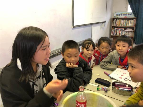 在保家小学,志愿者用PPT的形式,图文并茂地向孩子宣传了红岩精神,让孩子初步感受到了红岩精神。随后,志愿者便以魔法药水这个实验拉开了今天支教的序幕,在咕嘟咕嘟的药水沸腾声中,孩子们全神贯注地看着志愿者。之后,志愿者让孩子们去尝试自己配制魔法药水,孩子一边做试验,志愿者一边介绍原理,让孩子在实验中学到科学知识。紧接着,志愿者进行的不相认识的气球、气球飞行器、水中燃烧的蜡烛等实验.,分别从静电斥力、空气推力、物体的溶解与冷却三个角度为孩子呈现的神奇物理现象,在实验之后,志愿者先请孩子分析实验结果的原因,再通过分析孩子的想法从而导出了实验的原理。