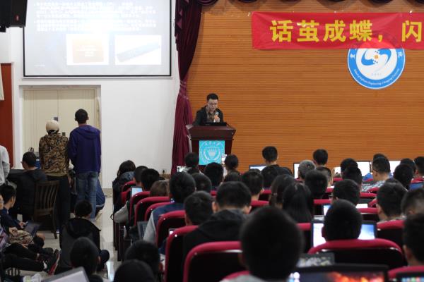 李琛上台进行简单的自我介绍后,开始从软件安装入手,给同学们进行培训。首先,他对如何安装软件进行了示范,解决了现场部分同学没有成功安装软件的问题。然后,再介绍了一下单片机的概念,在同学们脑海里构建了最基本的认识,成功调动了同学们的积极性。