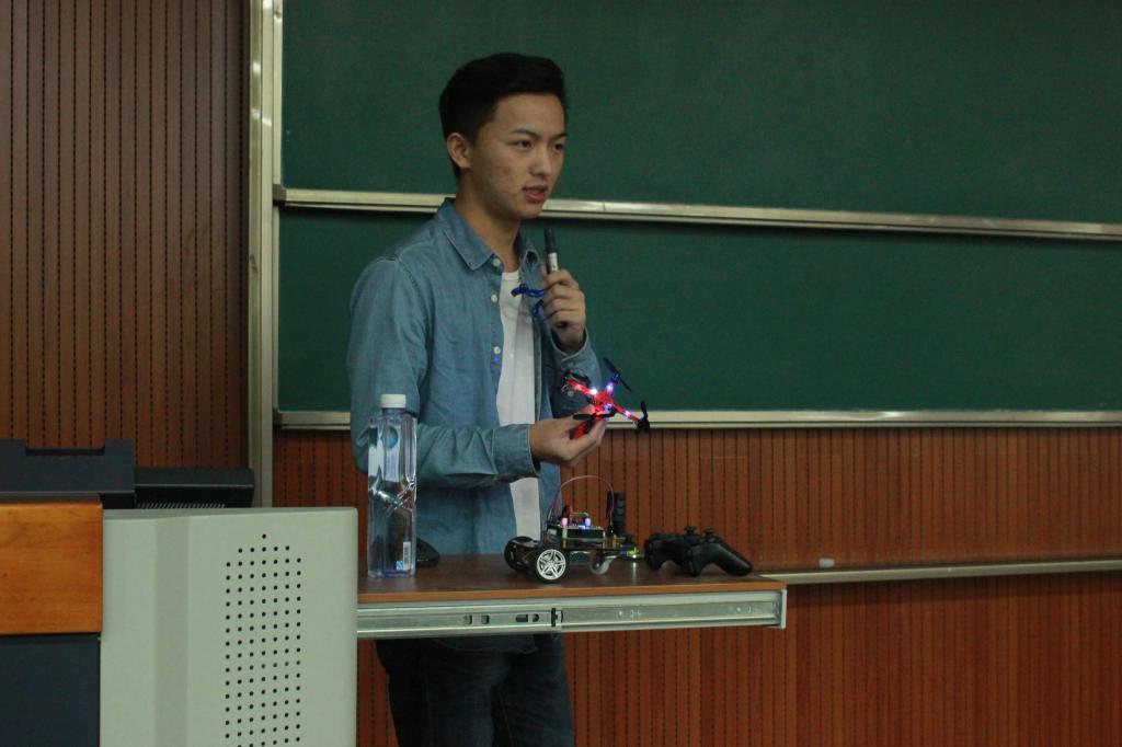接着,杨鸿城讲述了其参加各种比赛的原因主要是源于兴趣,并向大家展示了比赛成果:爬楼机器人、四轴飞行器、可控开门器、心形流水灯、智能窗帘等。