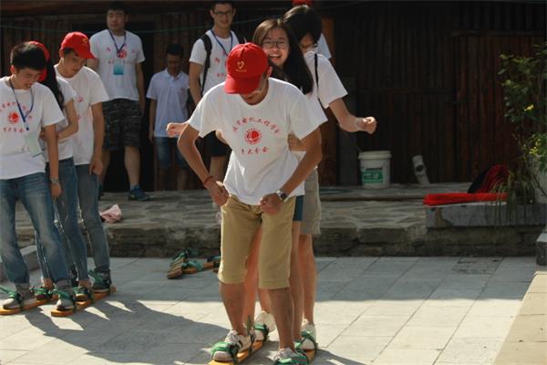 参观过程中,大家感受到了武陵风景之秀丽,领略了土家民俗之魅力。看到的是在博物馆的文字、图片及仿真实物,感动的的是土家人对土家民族千百年来文化传承的坚守。 从前的娱乐:体验民间游戏 穿过何家寨,舒大哥带领志愿者们来到了素有土家竞技场之称的熊家寨。寨子中的空地就是村民们的体育场,这里经常举行爬杆、斗鸡、滚铁环、传统板鞋等民俗体育项目。这个充满活力的民族,居然能将普通的两根木棍简单组合成“高跷”,将两块木板华丽变身成“三人板鞋”,将两根铁丝绕成“铁环”等器材,从而展开竞技娱乐。在了解了各个竞技游戏的规则后,志愿者们和当地居民自发组织了一场板鞋竞速比赛,体验了一次不一样的土家民俗体育竞技。