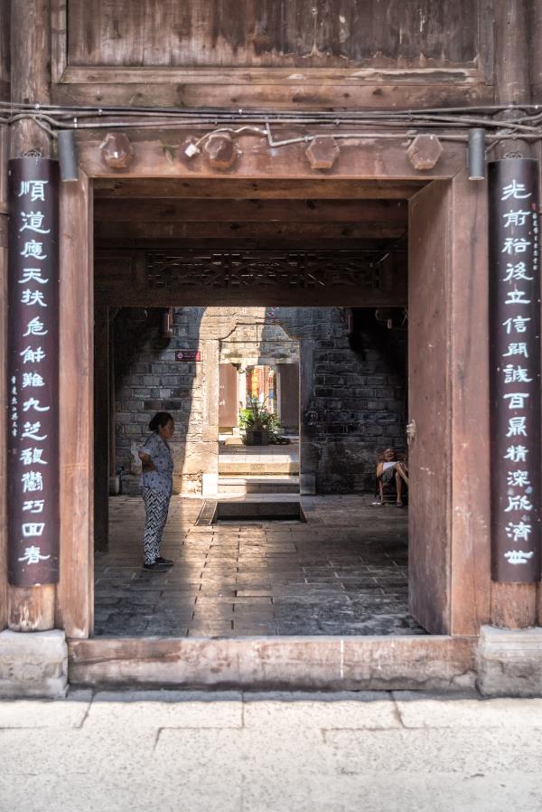 一次简单的体验,却将土家人团结协作、同舟共济的集体精神给志愿者们留下了深刻的印象。正是这种精神,将土家文化不断创新代代相传。 沧桑的建筑:留住岁月脚步 土家族的民居建筑大多是依山而建,多为土质结构和木质结构,且多数为吊脚楼。重庆市黔江区濯水古镇很好地保存了一系列土家族民居古建筑,每一栋都历经沧桑而风采依旧,有着自己特别的故事。 志愿者们沿着古镇的主街,跟着当地的居民进行参观。“这是光顺号,是以主人俞光顺的名字命名的。俞光顺是一位医术高明的盲人,但是他心地善良,助人为乐,所以很受当地人尊重,这个院子就是以他的名字命名的。”一个人只有懂得付出,懂得奉献,才能够获得相应的尊重。三下乡志愿团团长李非凡也与带路的当地居民聊到:“咱们三下乡团队也是秉承着‘互相帮助、助人自助、无私奉献、不求回报’的志愿者精神开展系列活动。”