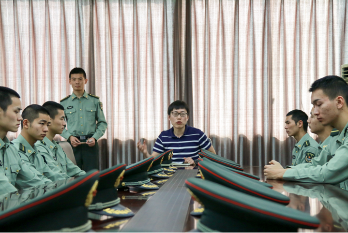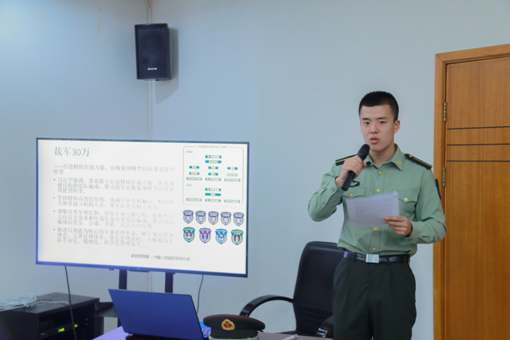 三名国防生代表分别做了主题报告。王宇详细介绍了军改的有关内容,重点解读了七大军区调整、裁军30万和军队政治生态建设。向浩结合自身经历,分享了自己的爱国情怀,重点强调捍卫网络国防和意识形态安全。童湛安心介绍了萨德系统的相关知识,重点讲解了技术性能。