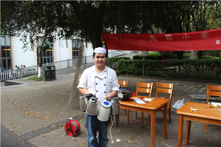这期间,一直有路过的行人被吸引过来,询问之后取了电器送过来,有保安大叔的电饭煲、食堂马师傅的电热水壶、教职工家属徐阿姨的电热水壶和小音箱等。