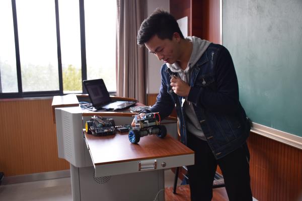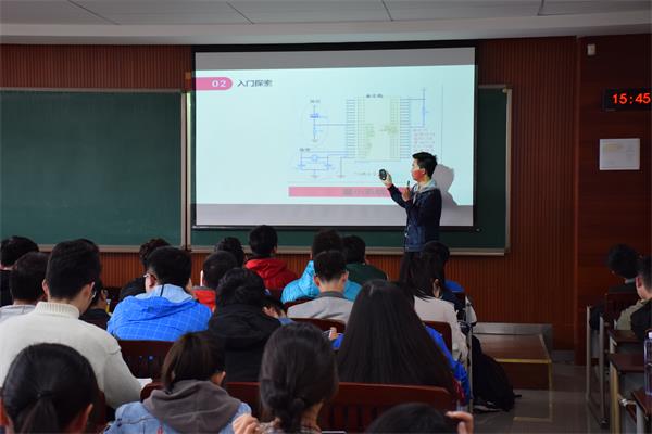 之后,便是对单片机入门的具体讲解。讲解之前,他播放了一个关于单片机前沿科技成果的视频,同学们眼中放出了光彩,纷纷摩拳擦掌想要一探究竟。杨鸿诚以51单片机开发板的介绍和C++学习网站的分享引入到单片机入门的具体探索方法。从硬件设计、软件设计以及机械结构的各方面介绍,来让大家对于单片机的学习方法打好坚实的框架,也为同学们指明了学习电子设计的方向,以让同学们少走弯路。然后,便是进阶之路部分。51单片机的功能并不能满足更高级的电子设计爱好者的要求,杨鸿城为水平较高的同学介绍了更高级STM32单片机的学习方法,并给这些同学提指点迷津,以不断冲击更高的水平。在最后的答疑环节中,更有好学的同学一直追问,对于电子设计的热爱溢于言表。