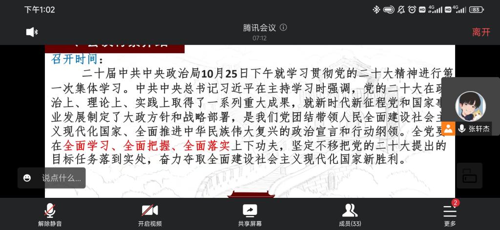 本科生一支部在线上开展了本学期第二次组织生活,本次组织生活以“献礼二十大,强国新征程”为主题,由张轩杰同志主持,一支部全体党员参加。