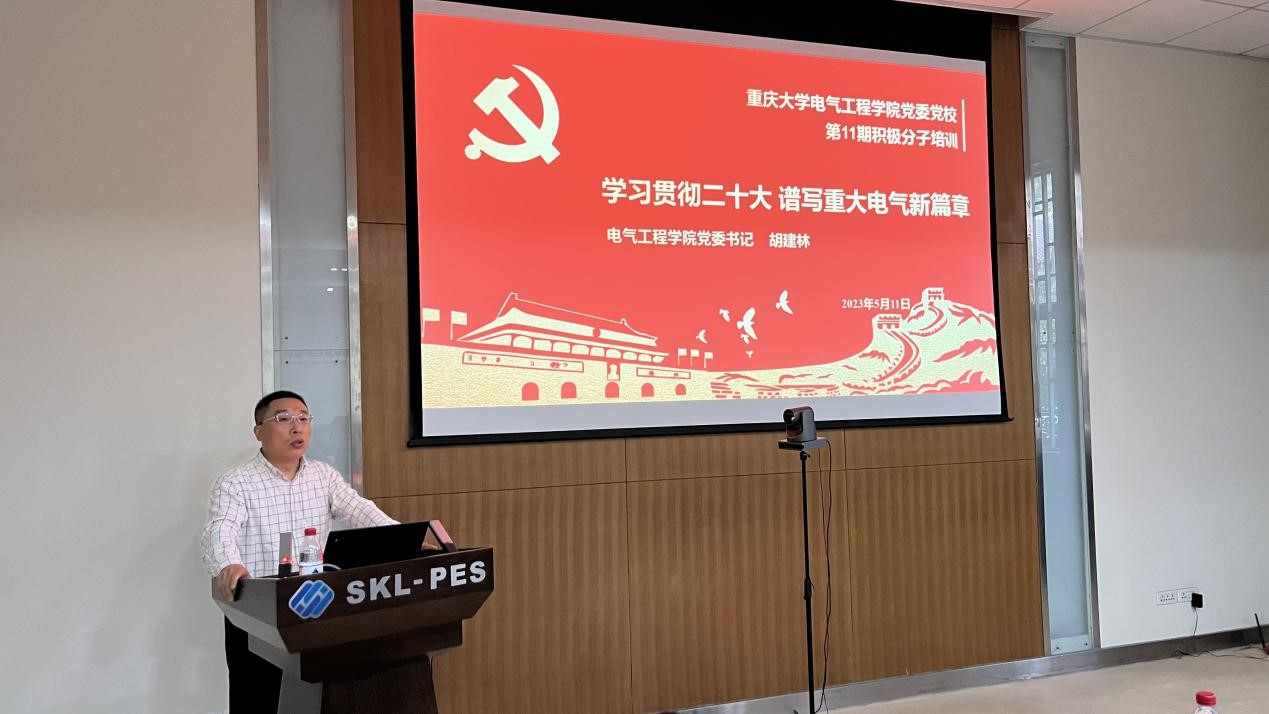 第11期入党积极分子培训班开展第二次集中学习,学院党委书记胡建林以《学习贯彻二十大、谱写重大电气新篇章》为题讲授专题党课。会议由学院党委副书记吴嘉主持。