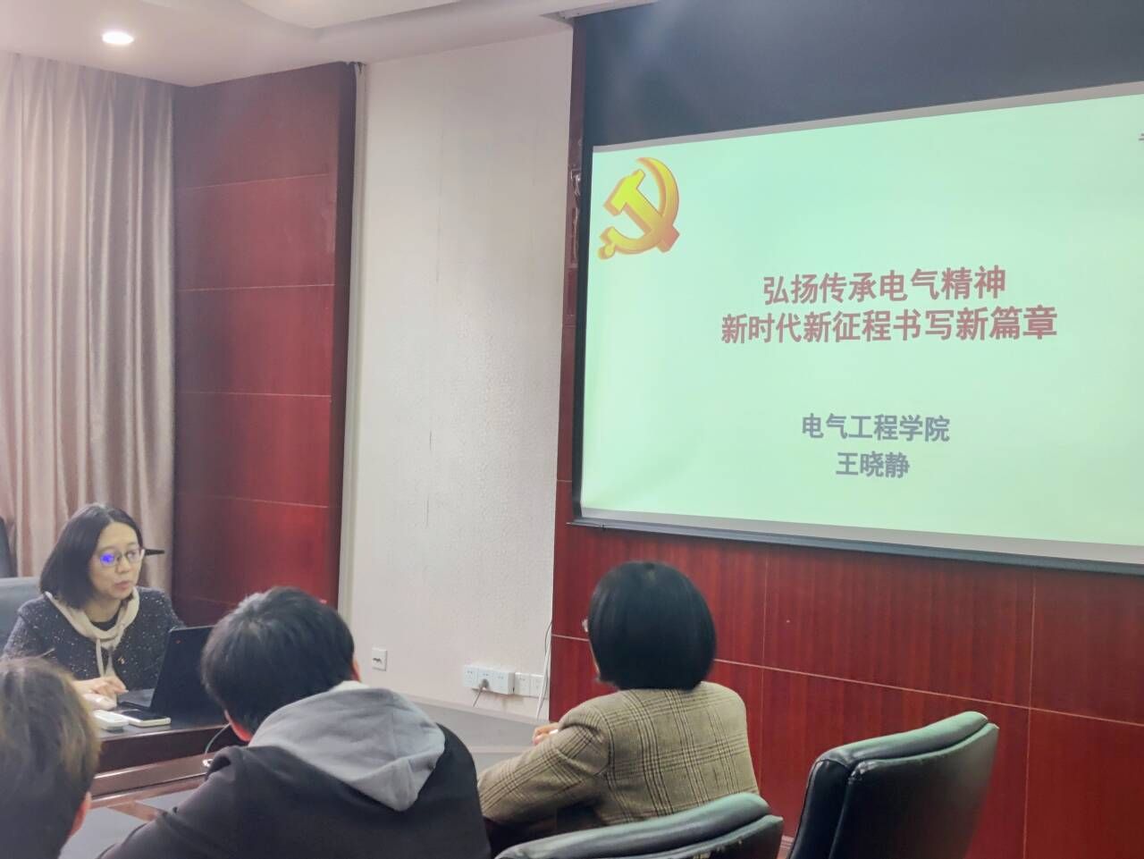 党委副书记王晓静在A6327会议室为本科三支部全体党员以及2021级全体发展对象以“弘扬传承电气精神 新时代新征程书写新篇章”为题讲授了一堂主题教育专题党课。党课由支部书记陈思思主持。