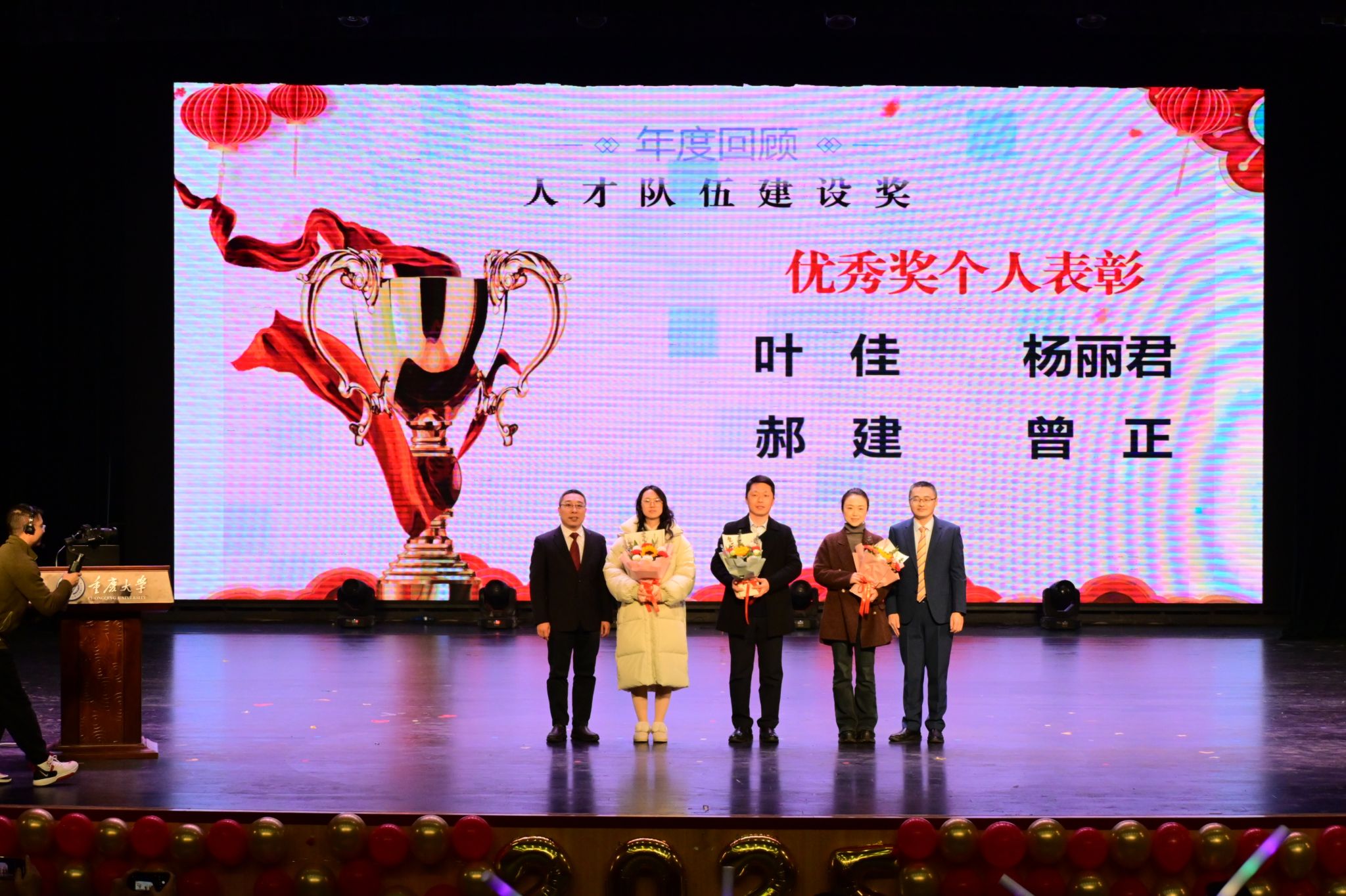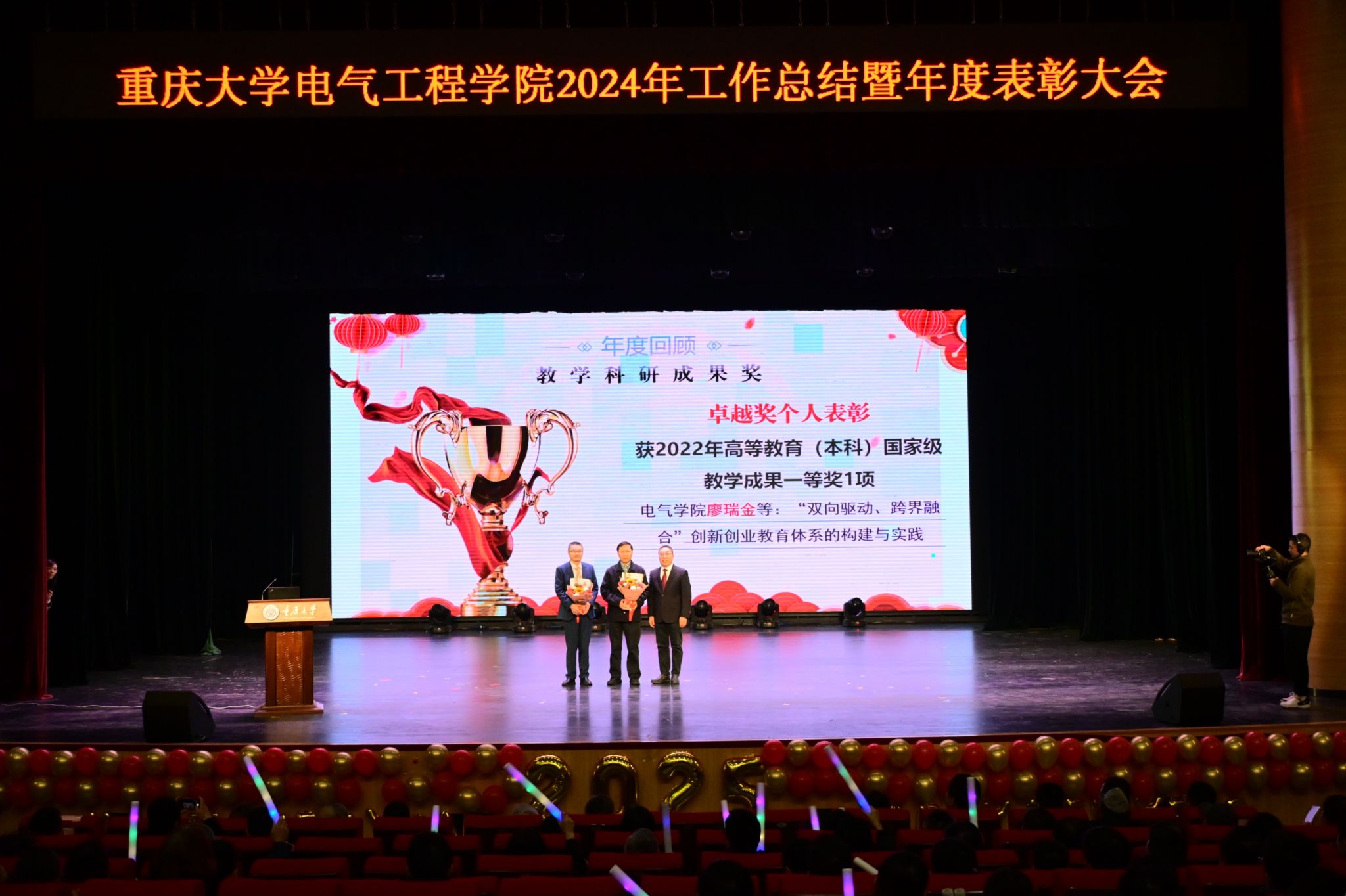 接着,学院对 2023 - 2024 年度在教学科研成果、人才队伍建设、教书育人等方面成绩卓著的先进个人予以表彰。党委书记胡建林代表学院为2022年高等教育(本科)国家级教学成果一等奖、卓越奖个人获得者廖瑞金,2021、2022年高等学校科学研究优秀成果奖自然科学一等奖、优秀奖个人获得者谢开贵两位老师献花,感谢其在教学科研的深海中披荆斩棘,推动学院学术巨轮破浪前行;胡建林、谢开贵代表学院为人才队伍建设奖获得者叶佳、杨丽君、郝建、曾正等优秀奖个人献花,感谢其为学院师资队伍的发展添砖加瓦、进一步稳固根基;胡建林、谢开贵代表学院为教书育人奖获得者,猫都论坛