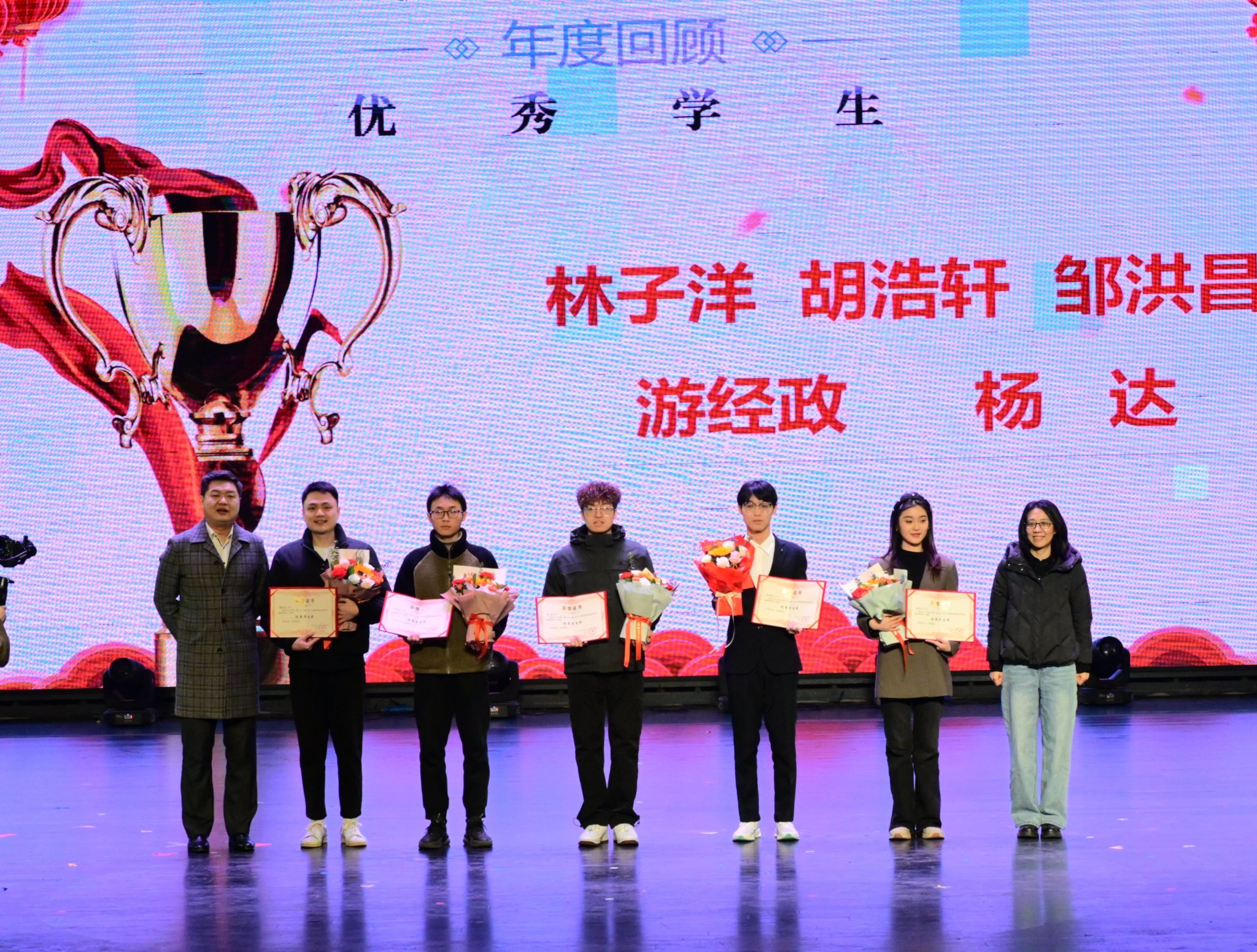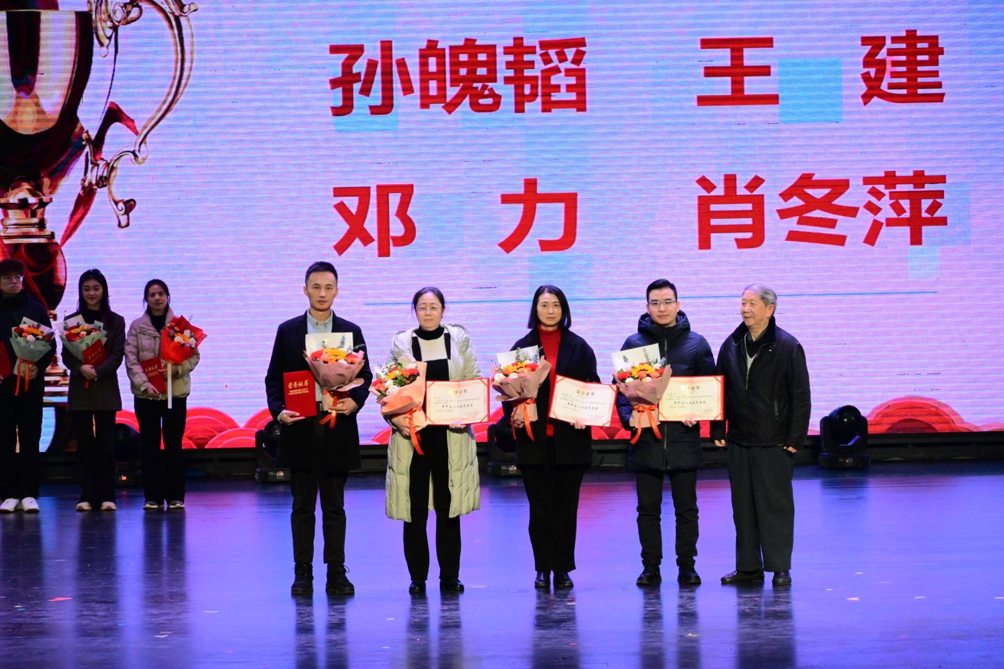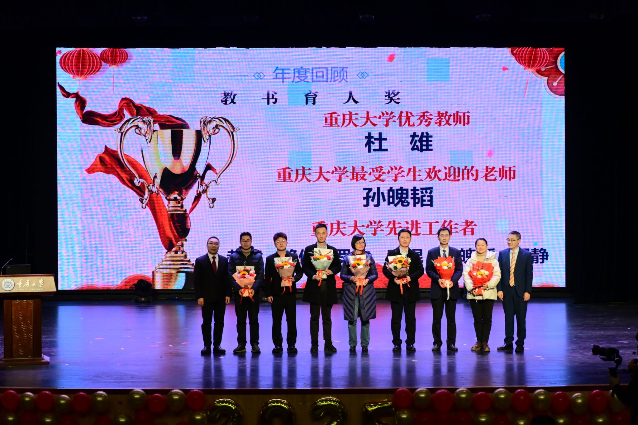 先进工作者郝建、赖伟、罗敏、毛锟、孙魄韬、周静等老师献花,感谢其心怀大爱,于课堂内外,倾囊相授,以爱育桃李,引领学生逐梦远航。