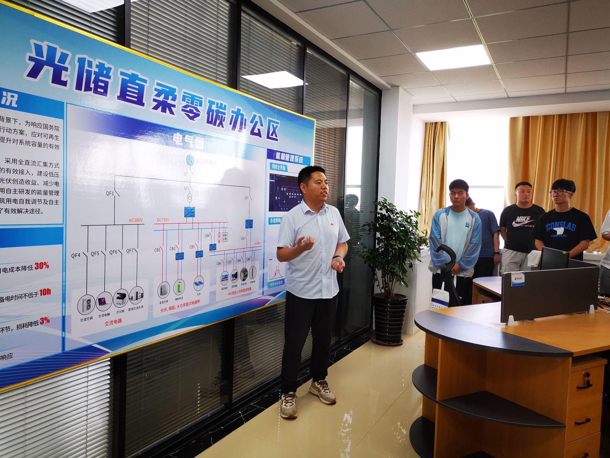 技术人员向实践团成员讲解“光储直柔”零碳办公区