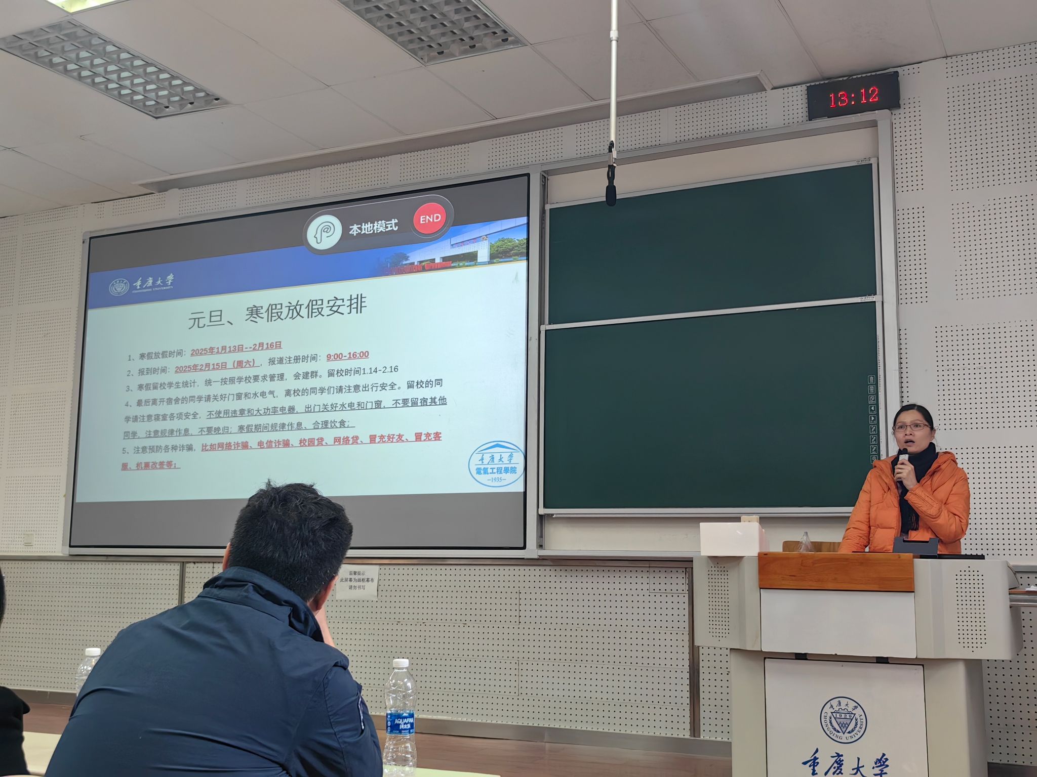 喻惠对本学期年级开展的包括奖助学金的评定、争先创优评定、党团工作等工作进行介绍,并详细说明了各项工作的进展和完成情况。此外,她还特别就元旦和寒假的放假安排进行说明,包括元旦放假安排、请销假制度、以及下学期开学报道安排等。同时,喻惠对同学们并进行了国家安全与保密、防电信诈骗、消防安全、校园交通安排、出行安全、反邪教等安全教育,也希望各班级通过班会等活动进行专题学习,进一步强化自身的安全意识。